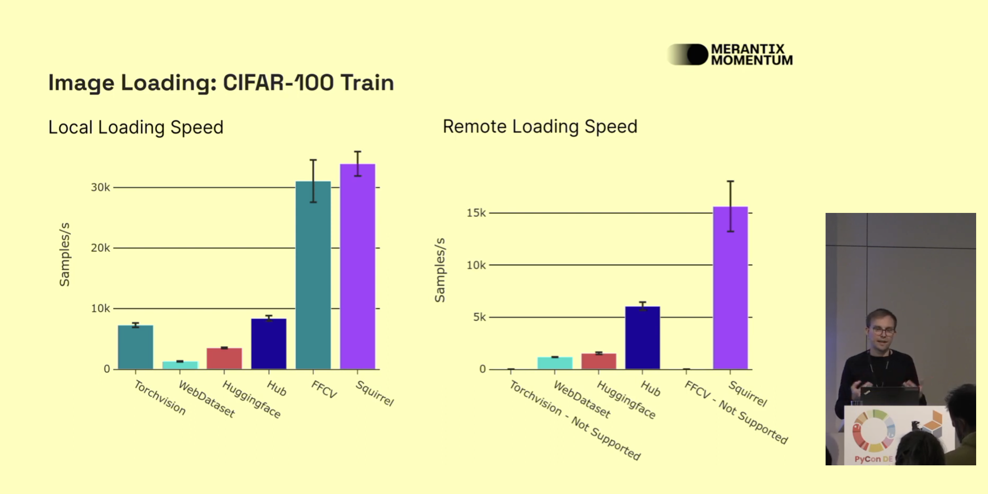 At Merantix Momentum, I'm benchmarking our data loading tool Squirrel. Preliminary results show that data loading pipelines can benefit greatly from Squirrel's improved throughput. Upon open-sourcing Squirrel, our VP of Engineering, Dr. Thomas Wollmann, showcased some of our initial results at the PyData 2022 conference in Berlin. I'm also an active code contributor to Squirrel. If you have feedback, let's chat! — with Dr. Wollmann.